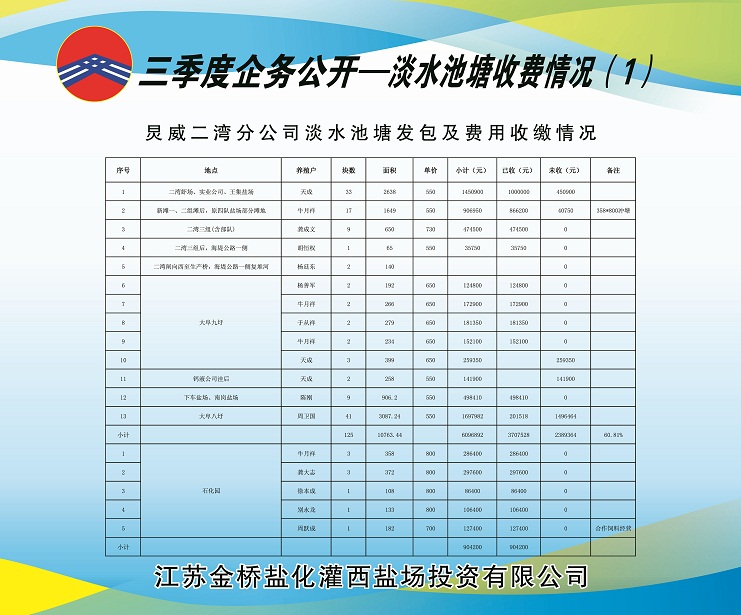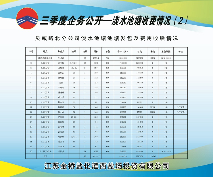 (一)海水養(yǎng)殖池塘發(fā)包及費(fèi)用收繳情況:共發(fā)包海水養(yǎng)殖池塘面積11927畝,應(yīng)收租賃費(fèi)382.7350萬元,已收租賃費(fèi)382.2690萬元,欠收租賃費(fèi)65.8970萬元,收繳率為84.33%。