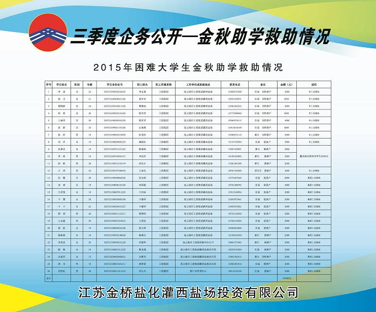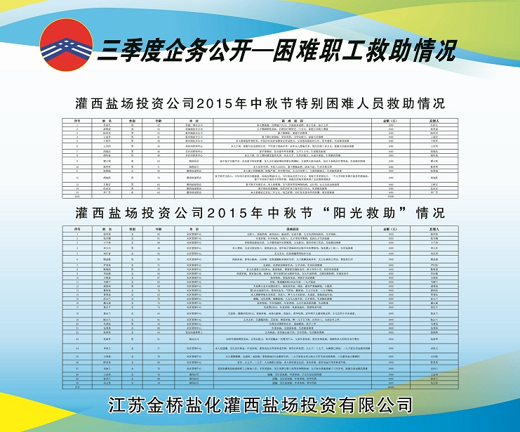 三季度,公司黨委積極做好走訪慰問、送溫曖工作,灌西鹽場投資公司、日曬制鹽公司對(duì)30名困職工發(fā)放陽光救助金30000元;對(duì)15名患重大疾病困職工及直系親屬發(fā)放救助金15000元;對(duì)26名困難大學(xué)生實(shí)行金秋助學(xué)金67000元。具體情況請查看公示展板。