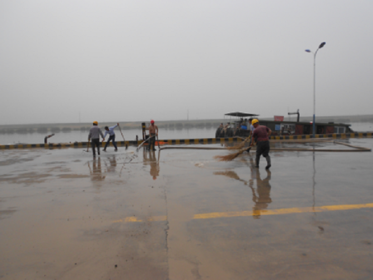 近期由于五灌河水位下降,給??看a頭的船只帶來了很大的安全隱患,于是公司決定對碼頭岸線的河道進行一次清淤工作,在清淤的運輸過程中使碼頭作業(yè)區(qū)一片狼跡,為了不影響宏港石化的PPA噸袋的吊裝業(yè)務(wù),6月11日上午公司班子成員主動放棄休息日與上班工人一道對碼頭作業(yè)區(qū)進行清理,他們有的用水槍沖,有的用掃帚掃,經(jīng)過二個多小時的奮戰(zhàn),作業(yè)區(qū)場地上渙然一新。(宵洋葛高平)