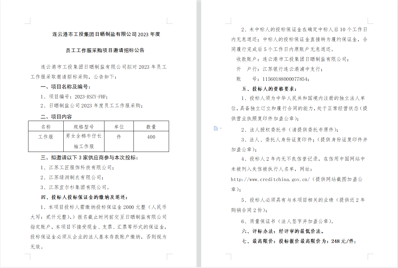 連云港市工投集團(tuán)日曬制鹽有限公司2023年度員工工作服采購項(xiàng)目邀請招標(biāo)公告