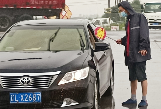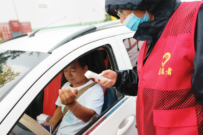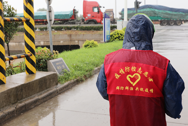“您好,請出示一下行程碼,做下登記?!眻允卦趰徫?,逆風(fēng)迎雨,對車輛進行逐一登記和體溫檢查,絲毫沒有受天氣的影響。