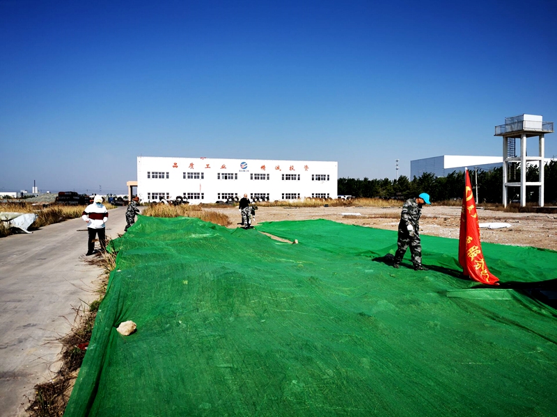 全體工作人員頂著烈日對(duì)黃土裸露區(qū)域進(jìn)行覆蓋。大家分工明確,有條不紊,一邊清理廢棄垃圾,一邊小心謹(jǐn)慎的扯著防塵網(wǎng)布與迎面吹來(lái)的大風(fēng)沙土博弈。大家不怕臟、不怕累,個(gè)個(gè)奮勇?tīng)?zhēng)先。經(jīng)過(guò)半天的辛苦勞動(dòng),就完成了近萬(wàn)平方的露天黃土覆蓋工作。放眼望去,一片“綠草茵茵”,看似不可能完成的任務(wù)在大家的同心協(xié)力下順利完工,自豪和喜悅油然而生。