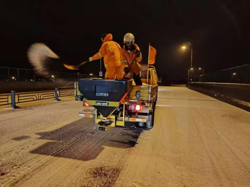 夜晚12點(diǎn),在佟圩路馬山立交,孫玉虎在工程車上一邊拋撒融雪劑一邊指揮:“融雪劑一定要撒布均勻,適當(dāng)擴(kuò)大距離,避免浪費(fèi)?!惫こ贪嘟鹑A、蘇志國(guó)、林軍、李林不停地在風(fēng)雪中揮舞著鐵锨,絲毫顧不上被風(fēng)雪擊打的面部疼痛。